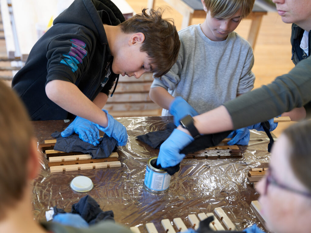 Neben seinem leichten Gewicht zeichnet sich der Tisch D7 durch eine besondere kommunikative Dimension aus. Der mittige Knick in der Längskante lädt ein, diesen als Drehpunkt zu nehmen und auch das Gespräch mit den seitlich sitzenden Nachbarn zu suchen – ähnlich einem runden oder ovalen Tisch. Die liebevollen Details, wie die besondere Ausarbeitung der Tischkanten oder die maßgefertigten Messingbeschläge, lassen das Betrachterherz höherschlagen. Ein haptisches Erlebnis vom Feinsten – und praktisch noch dazu.
