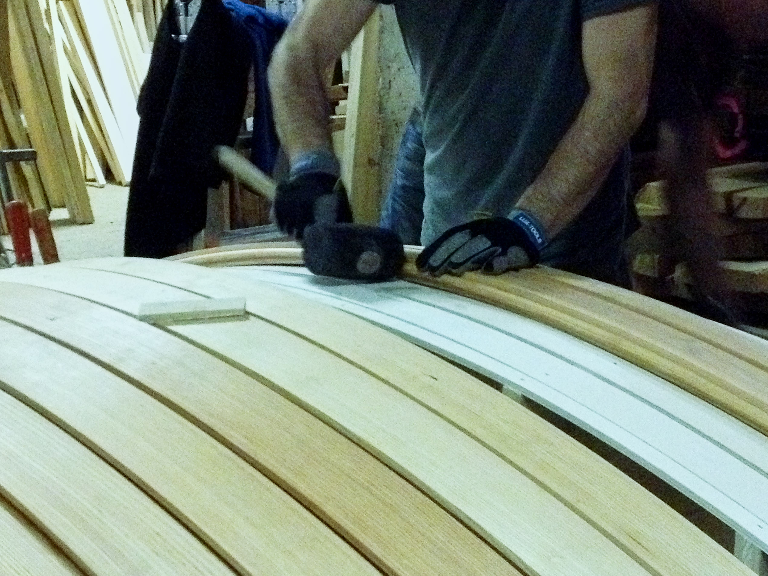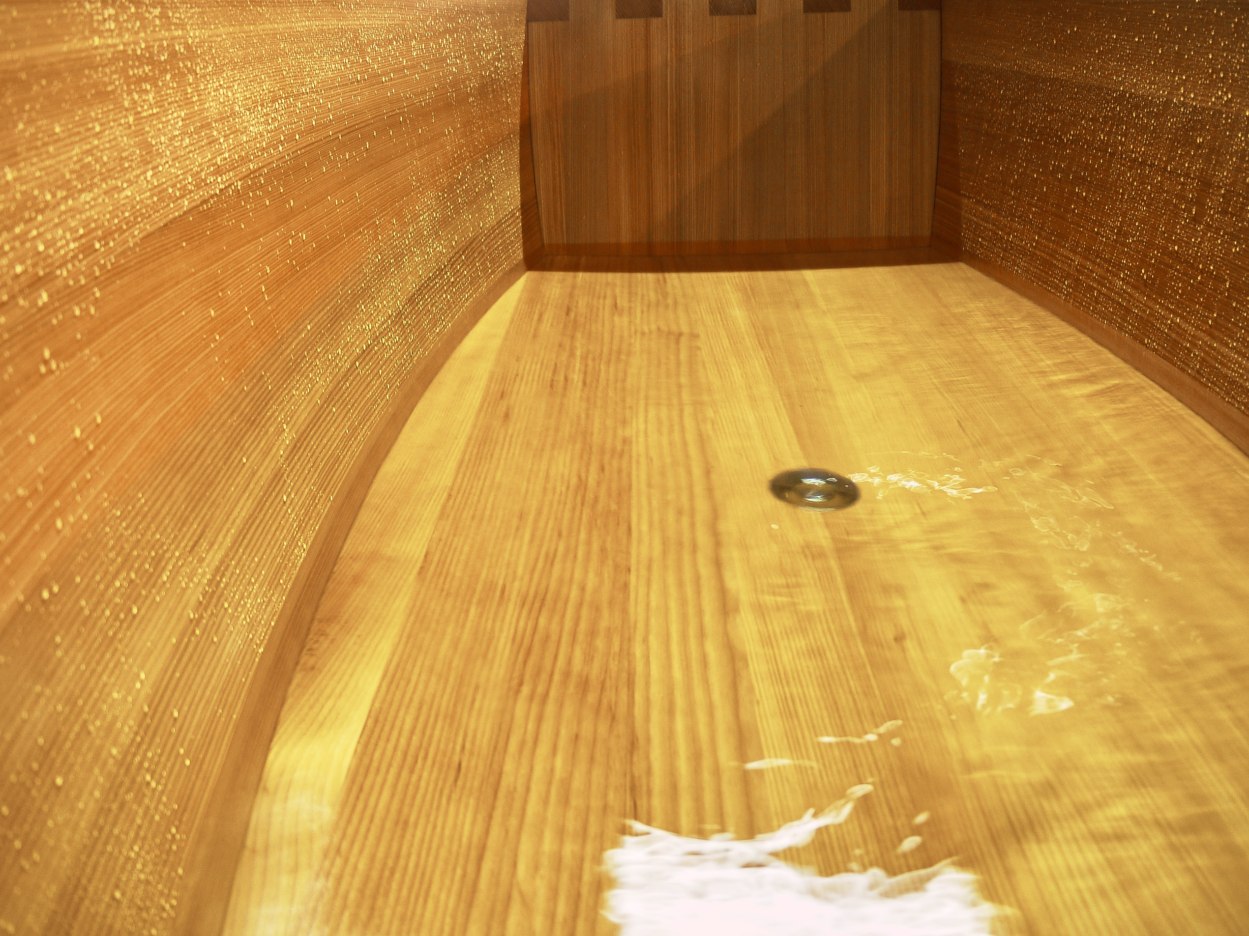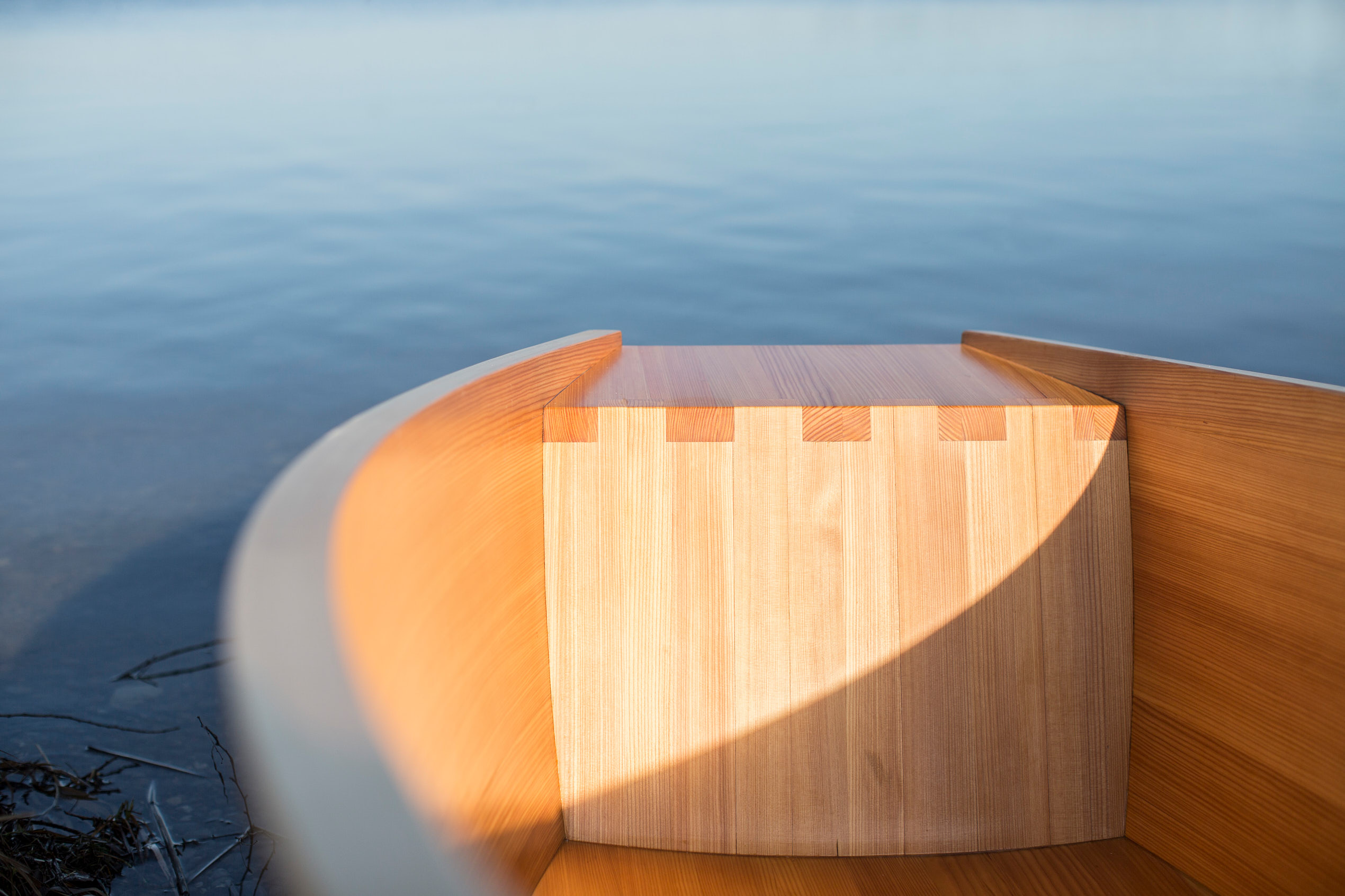 Für die beiden Seitenwände mussten die Lärchenbohlen gebogen werden. Dafür wurden sie in einer Dampfkammer erhitzt und anschließend rasch auf eine Schablone gespannt, wo sie kontrolliert auskühlen und ihre neue Form dauerhaft annehmen. Die Fugen wurden, angelehnt an klassische Bootsbautechniken, mit einer speziellen Nut und Kamm Fuge verleimt, die sich auch in den gebogen Teilen dicht fügen lässt. Denn wie im Bootsbau ist auch bei der Holzwanne die Dichtigkeit entscheidend: Erst das präzise Zusammenspiel von Holz, Fuge und Oberfläche sorgt dafür, dass das Bauteil dauerhaft wasserfest bleibt.
