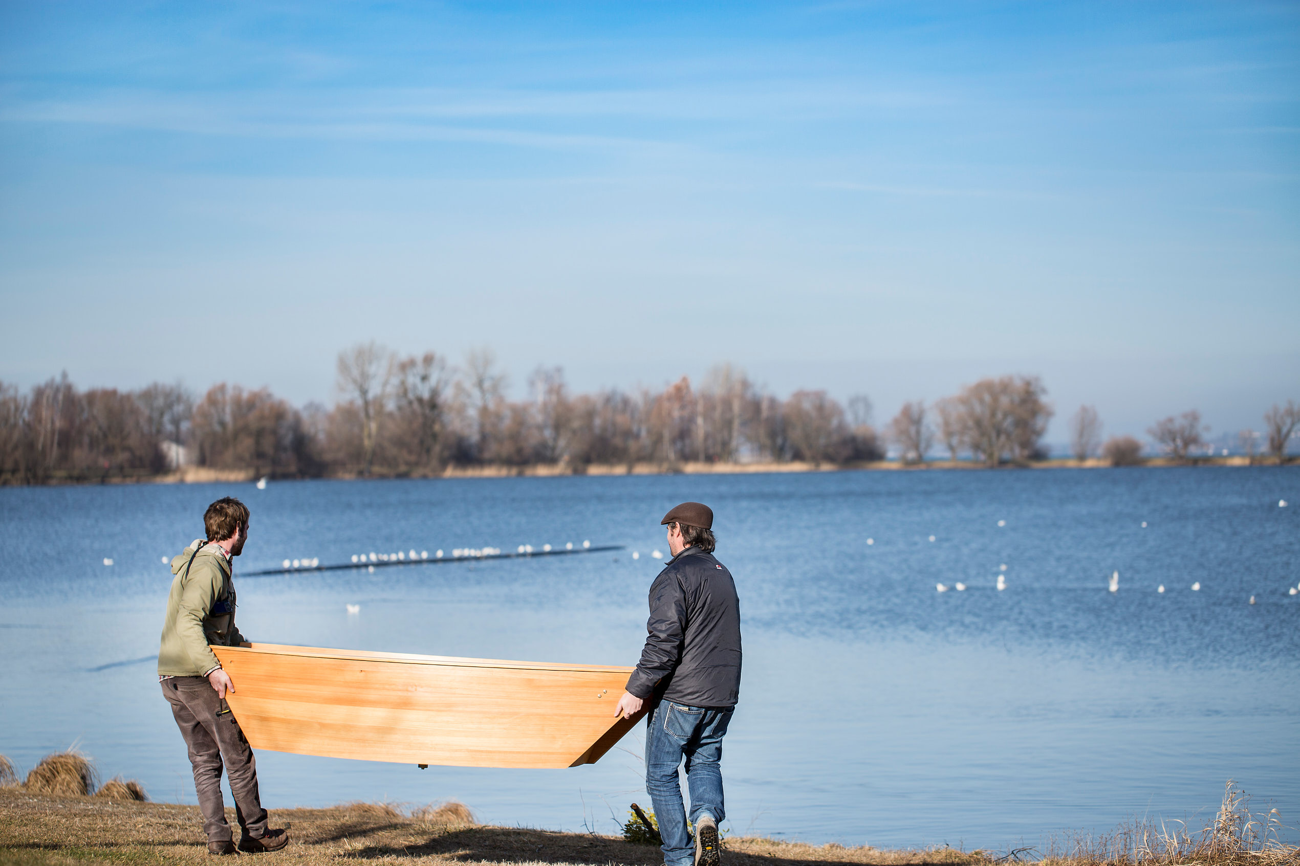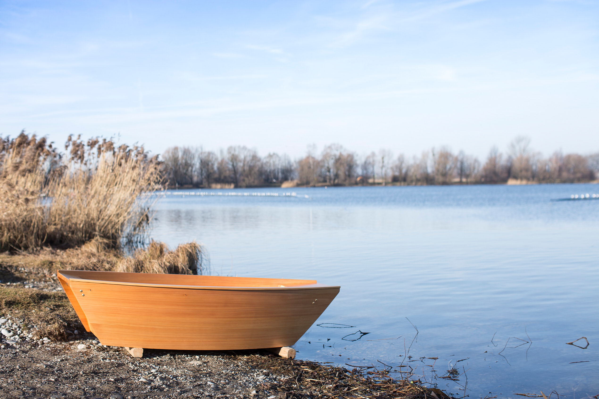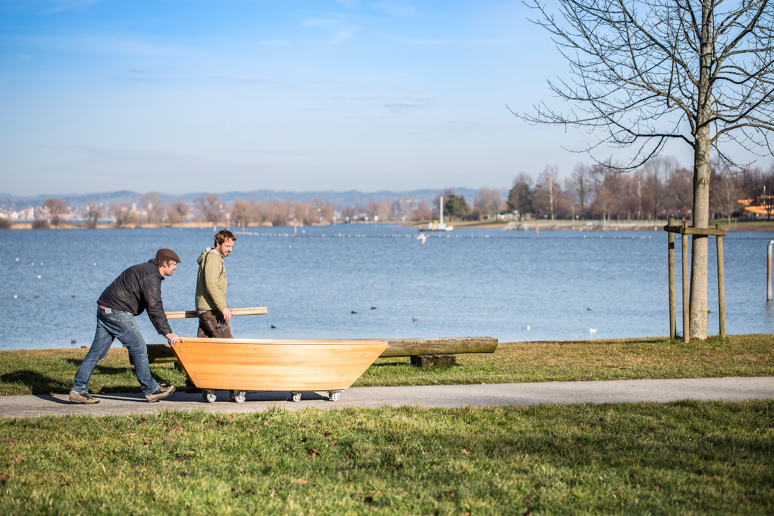 Die Form entstand in Anlehnung an traditionelle Flachboote aus Holz, die statt eines Kiels einen ebenen Boden besitzen. Solche Boote waren früher auch am Bodensee im Einsatz – als Lastenkähne für Getreide, Salz, Tiere oder Personen. Beim Material entschieden wir uns für Lärche, ein Holz, das im Bootsbau aufgrund seines hohen Harzgehalts, seiner natürlichen Witterungsbeständigkeit und Festigkeit seit jeher geschätzt wird.