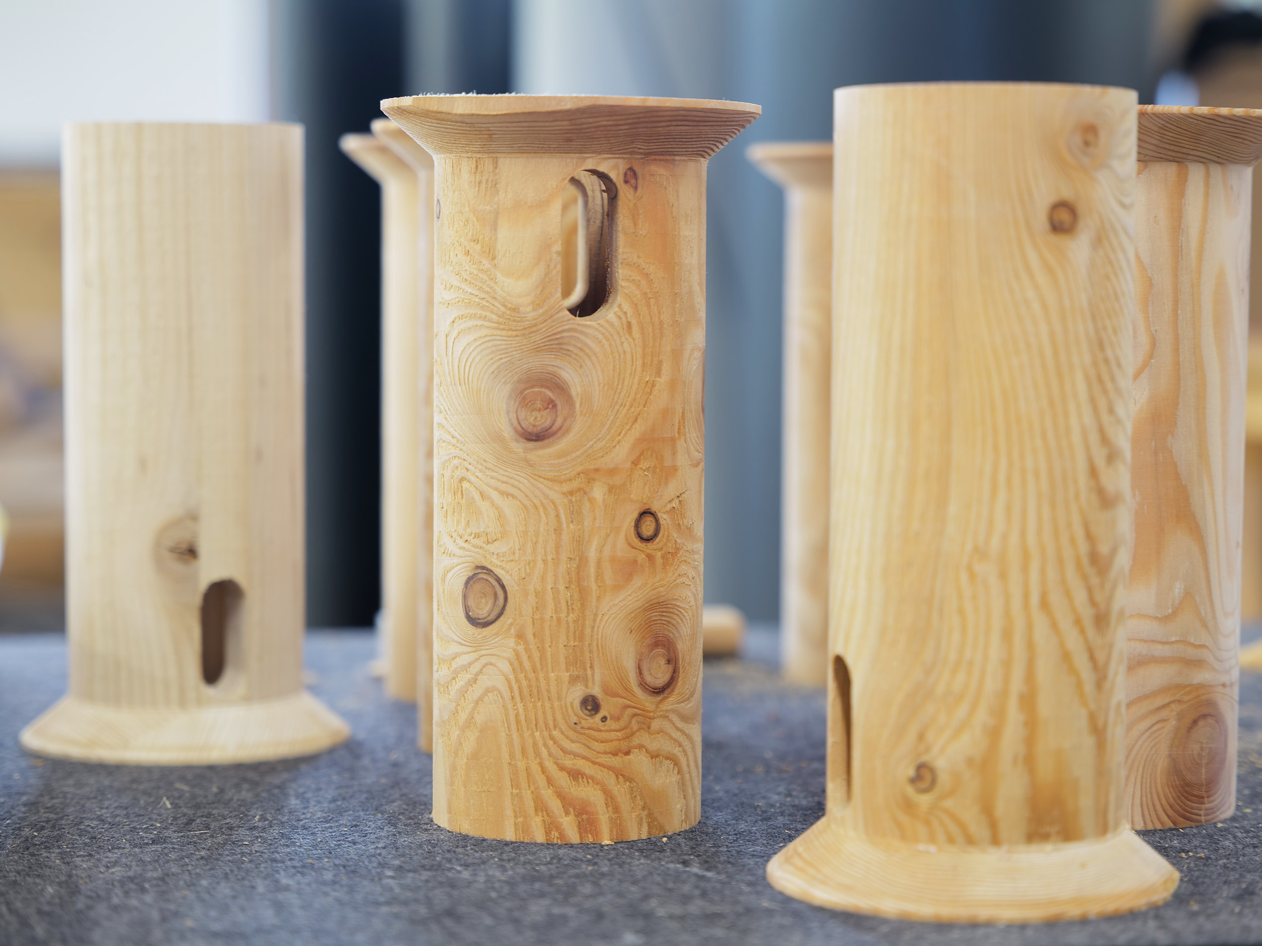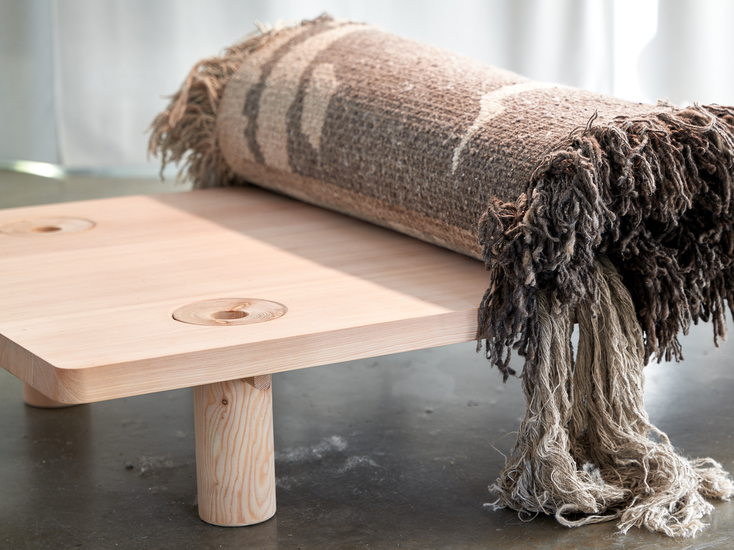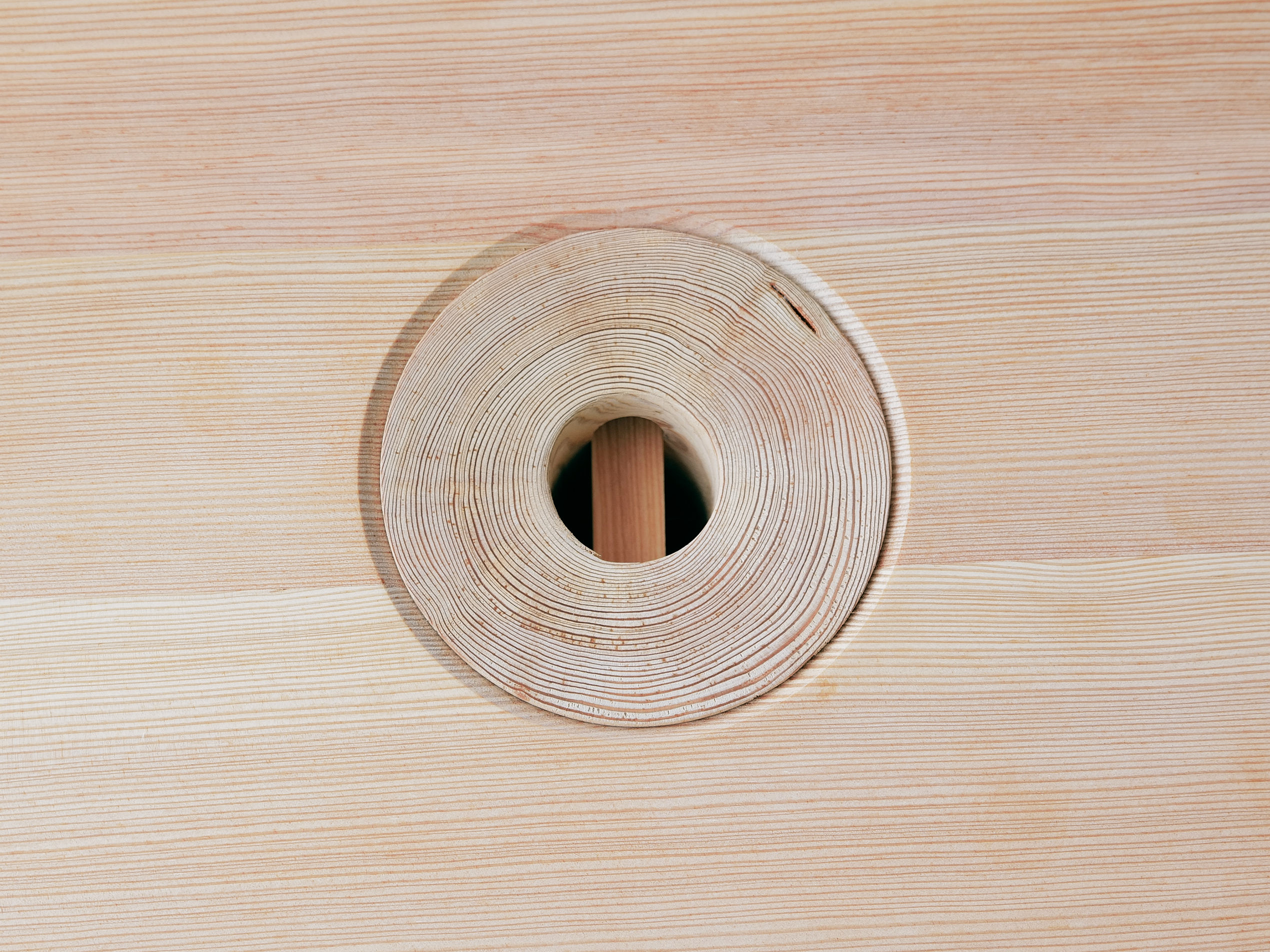 Eines dieser Objekte ist das Tagesbett „Mélèze“. Die Beine bestehen aus Stammabschnitten einer Lärche, die während eines Sturms umgestürzt ist. Verarbeitet wurde das Herzstück des Stammes, wodurch die Wachstumsphasen des Holzes als geschlossene Jahrringe sichtbar werden. Um die typischen Stirnholzrisse zu verhindern, wurde der Kern ausgebohrt. So wird auch das sonst verdeckte Innenleben der Keilverbindung zwischen Fuß und Platte sichtbar.