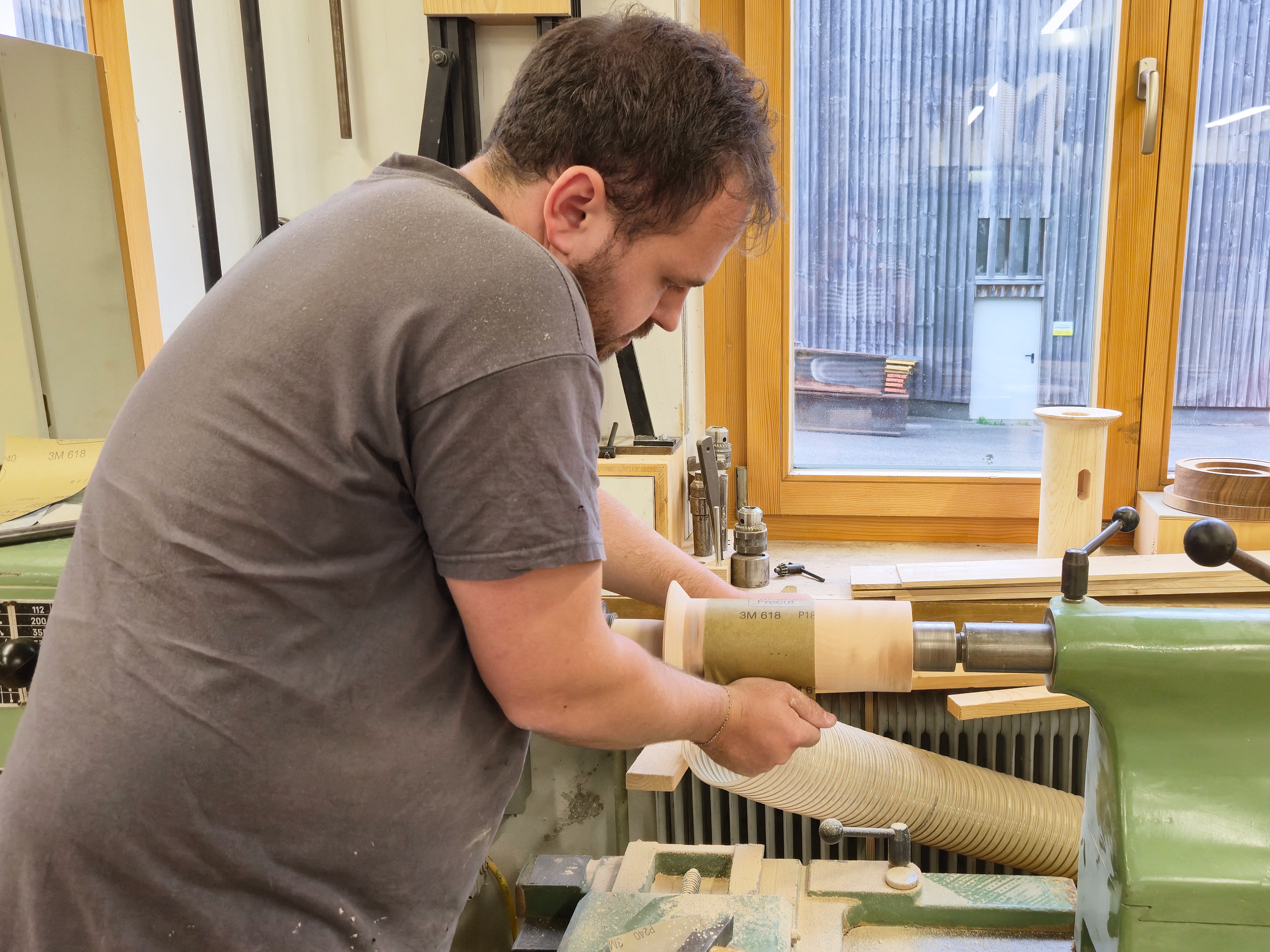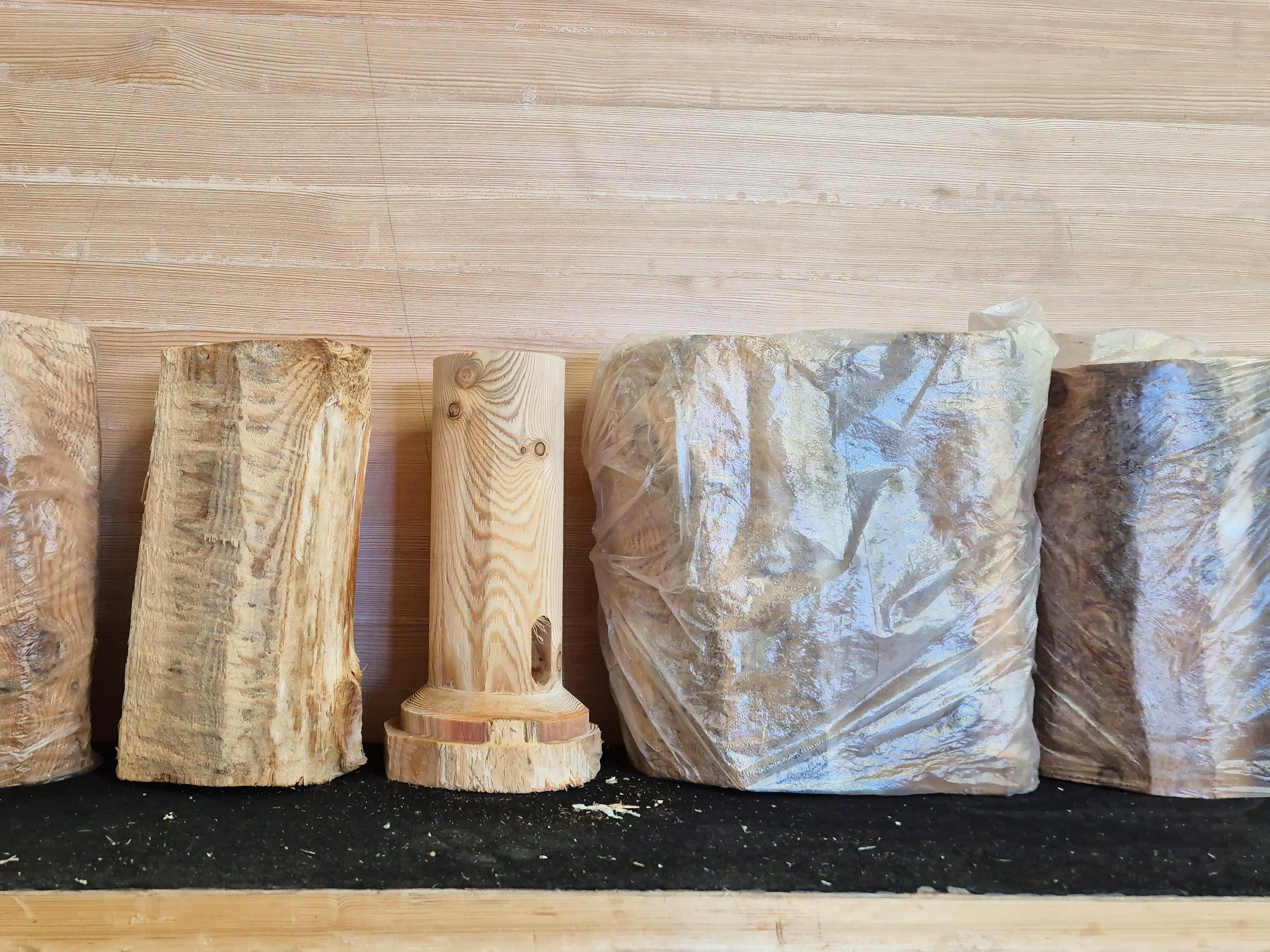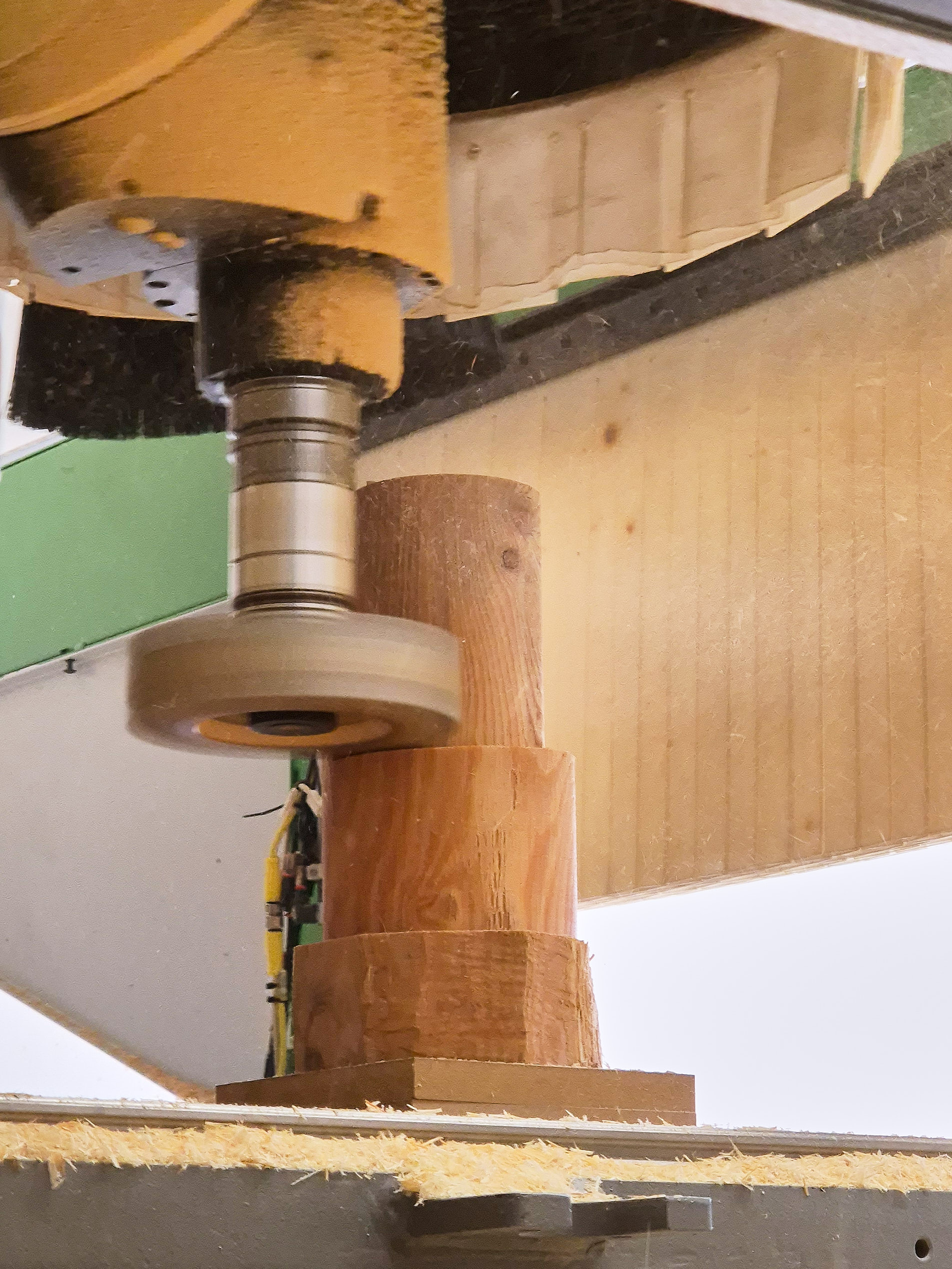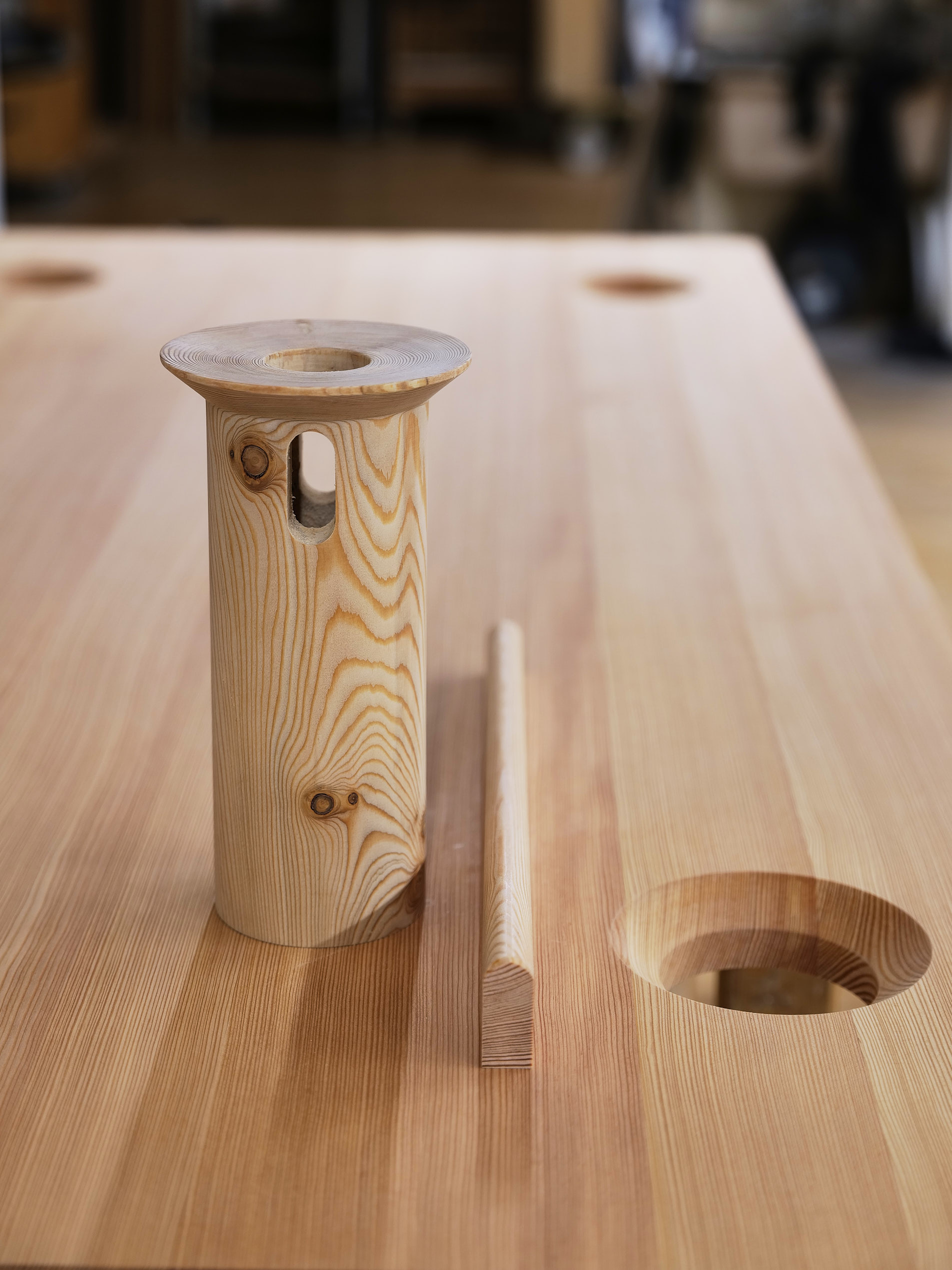 Eines dieser Objekte ist das Tagesbett „Mélèze“. Die Beine bestehen aus Stammabschnitten einer Lärche, die während eines Sturms umgestürzt ist. Verarbeitet wurde das Herzstück des Stammes, wodurch die Wachstumsphasen des Holzes als geschlossene Jahrringe sichtbar werden. Um die typischen Stirnholzrisse zu verhindern, wurde der Kern ausgebohrt. So wird auch das sonst verdeckte Innenleben der Keilverbindung zwischen Fuß und Platte sichtbar.