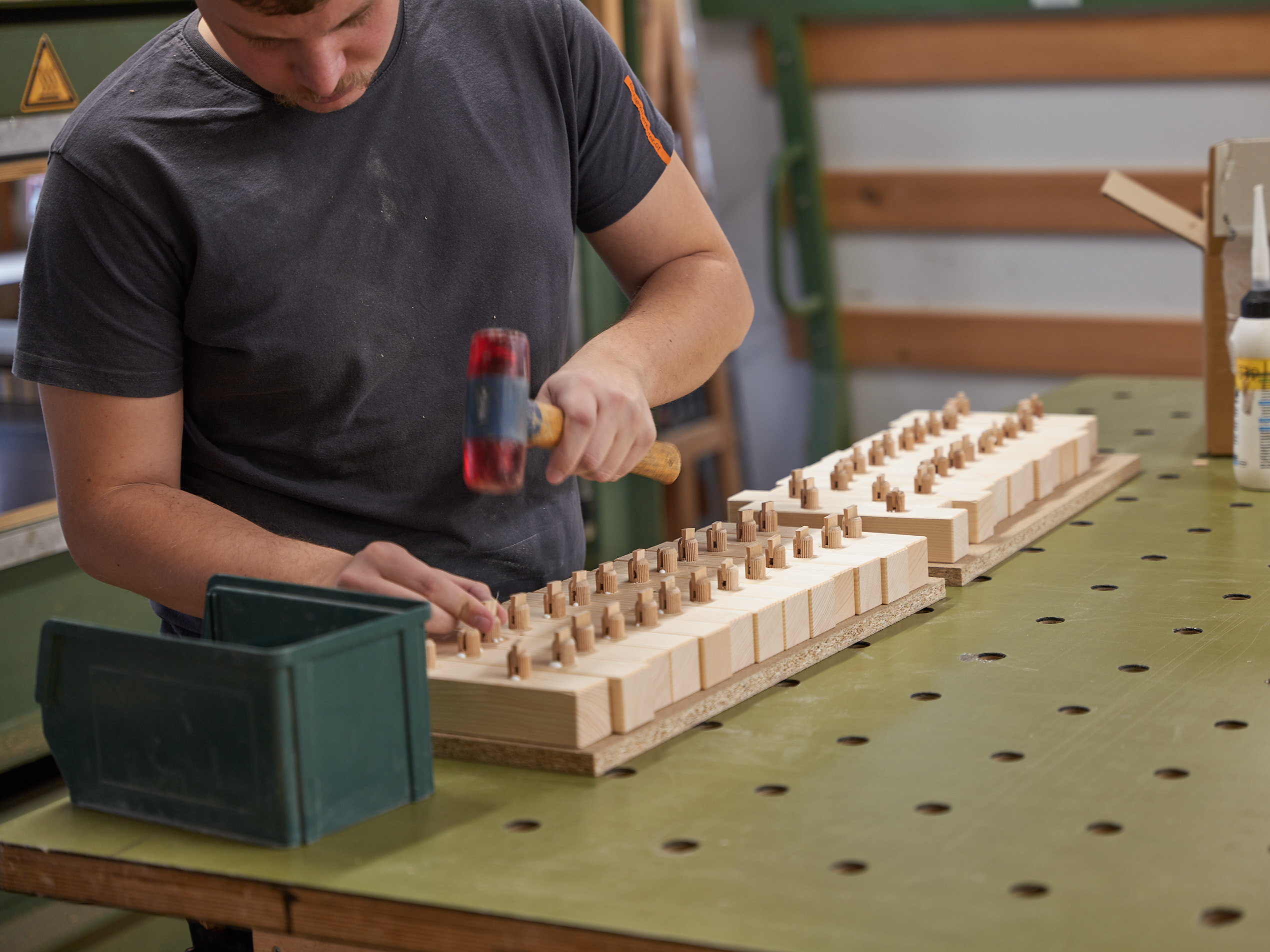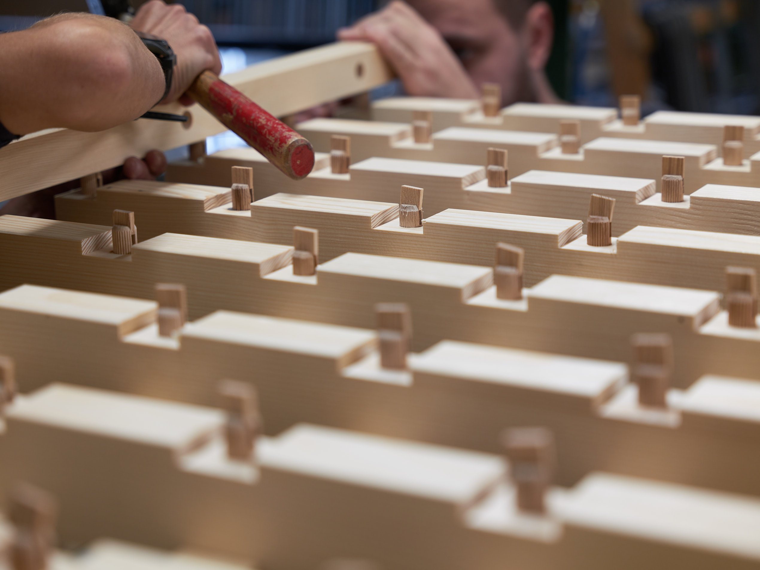 Jede Leiste wurde manuell gesägt, geschlitzt, gebohrt und verleimt.