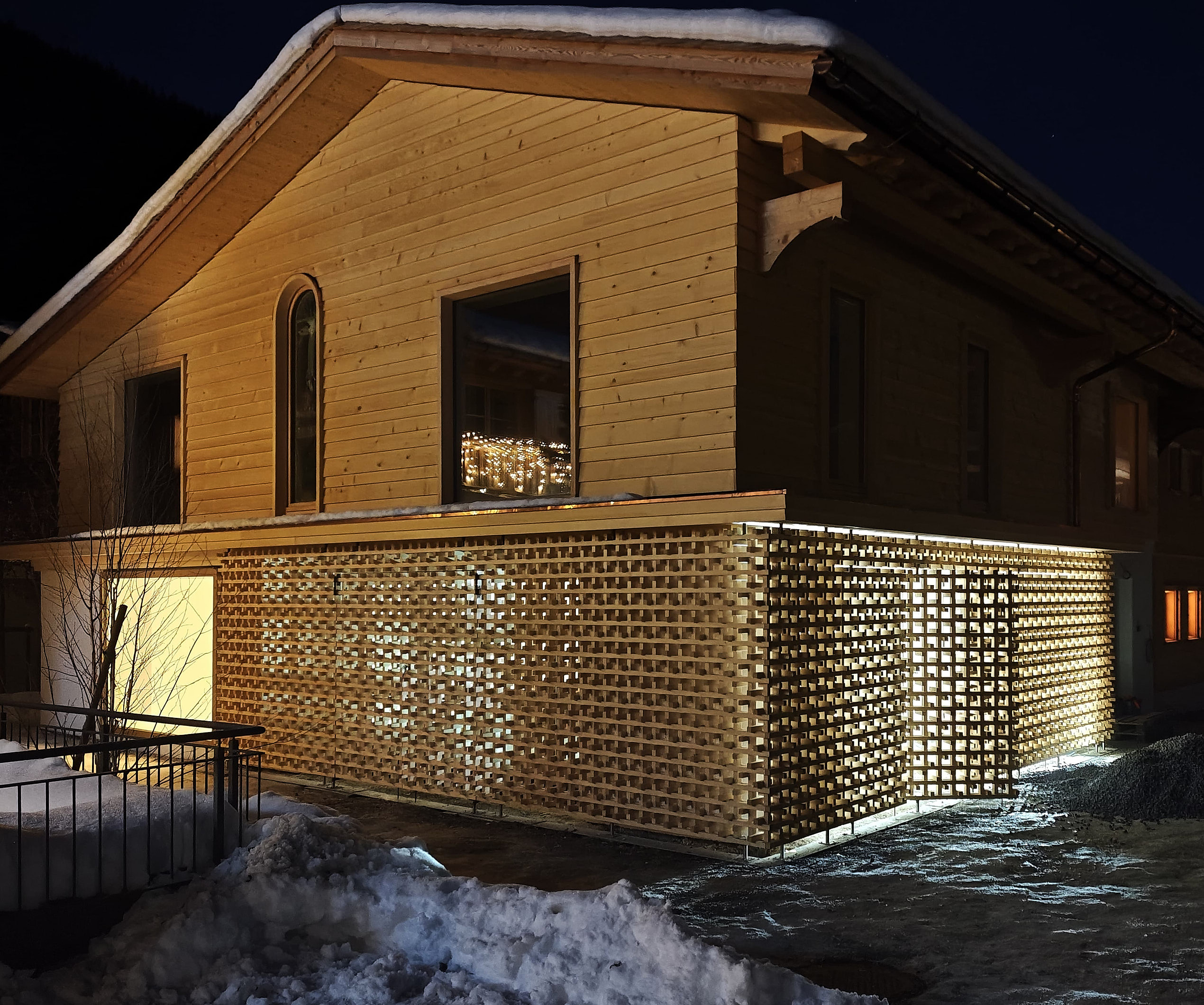 Das Walserhaus aus dem 16. Jahrhundert wurde in einem dreijährigen Restaurierungsprozess bis auf seine Grundstruktur freigelegt und der neuen Nutzung entsprechend erweitert. Dazu gehört unter anderem der Windfang des japanischen Architekten Shinichiro Ogata. Das räumliche Gitterwerk aus Fichte verbindet mit seinem Wechselspiel aus Licht- und Schatten die traditionelle Materialität des Ortes mit zeitgemäßer japanischer Gestaltung.